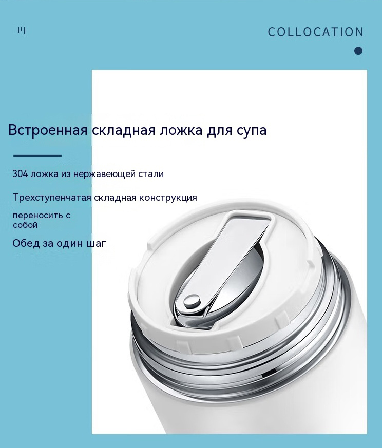 В комплекте складная ложка, а крышка может использоваться как миска — все для комфортного приема пищи.